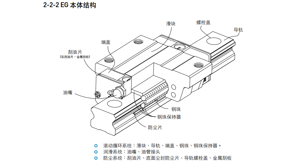 EG系列使用四列钢珠承受负荷设计,使其具备高刚性、高负荷的特性,同时具备四方向等负载特色、及自动调心的功能,可吸收安装面的装配误差,得到高精度的诉求;加上降低组合高度及缩短滑块长度,非常适合高速自动化产业机械及空间要求的小型设备使用。滑块上设有钢珠保持器以防止钢珠脱落,此设计不仅方便客户安装直线导轨,当取下滑块时亦不会有钢珠脱落的情形发生,且在精度允许下具备互换性。